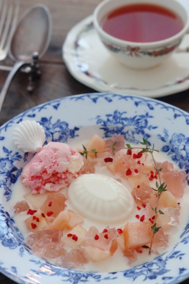桃のゼリー、ブランマンジェ、スモモのアイスクリームなど