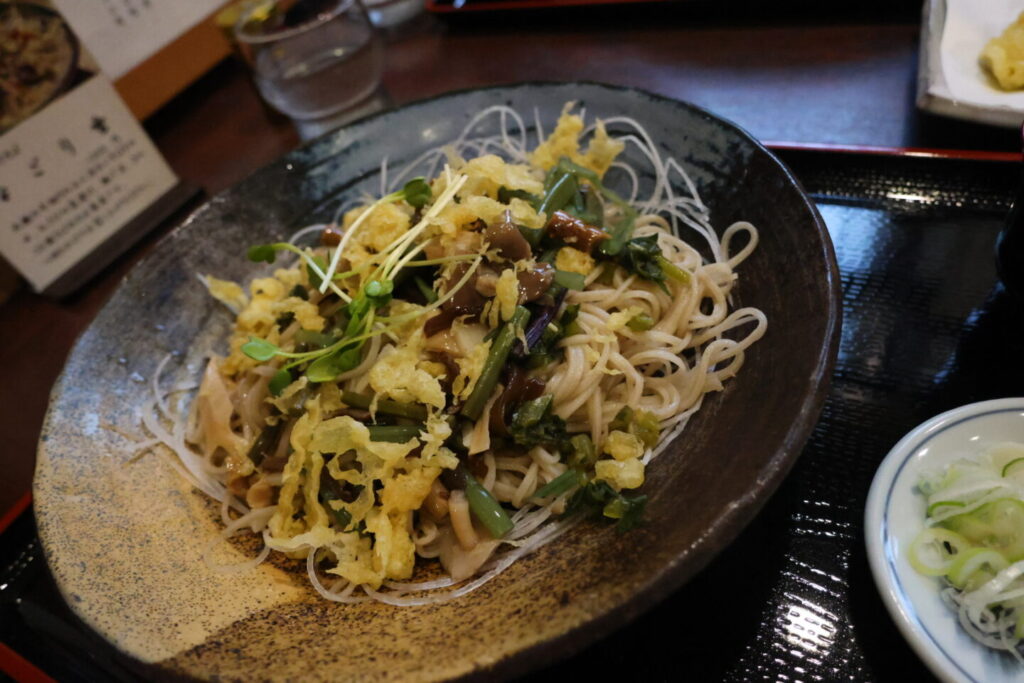 蕎麦の上に大根の千切り、わさびの茎漬け、揚げ玉、きのこが散りばめられたぶっかけ蕎麦。