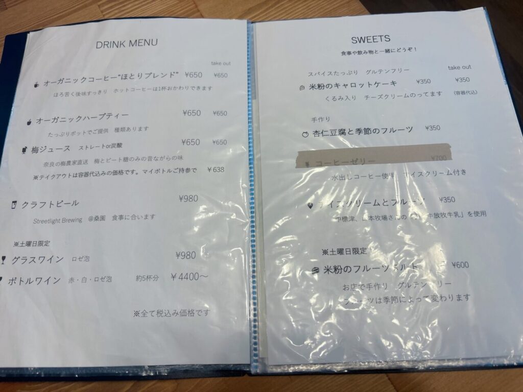 ドリンクとスイーツメニュー。