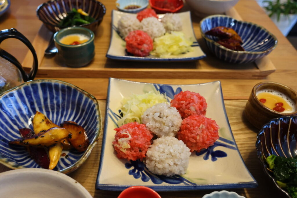 ピンクと白でお祝い御膳みたいです。