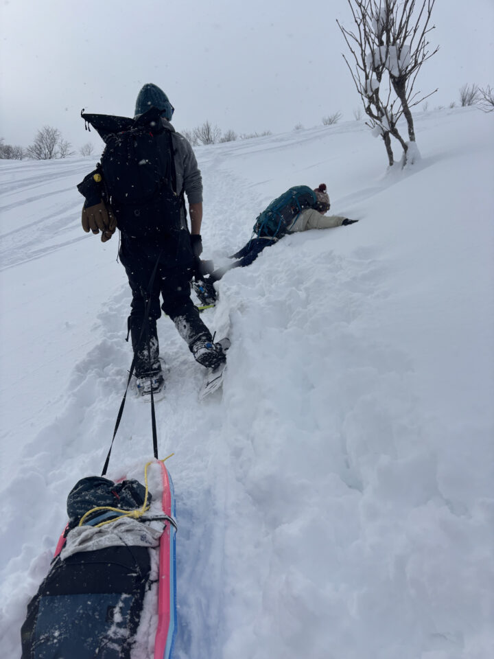 私は途中で弱音を吐き、体力尽きたら先に途中でソリ滑りしますと言ったら